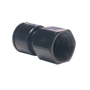 DM Fit 8mm push fit x 3/8" BSP (cone end) female adaptor manufactured from a black acetal copolymer, which is a safe and non-toxic material suitable for potable liquids and applications involving foodstuff.