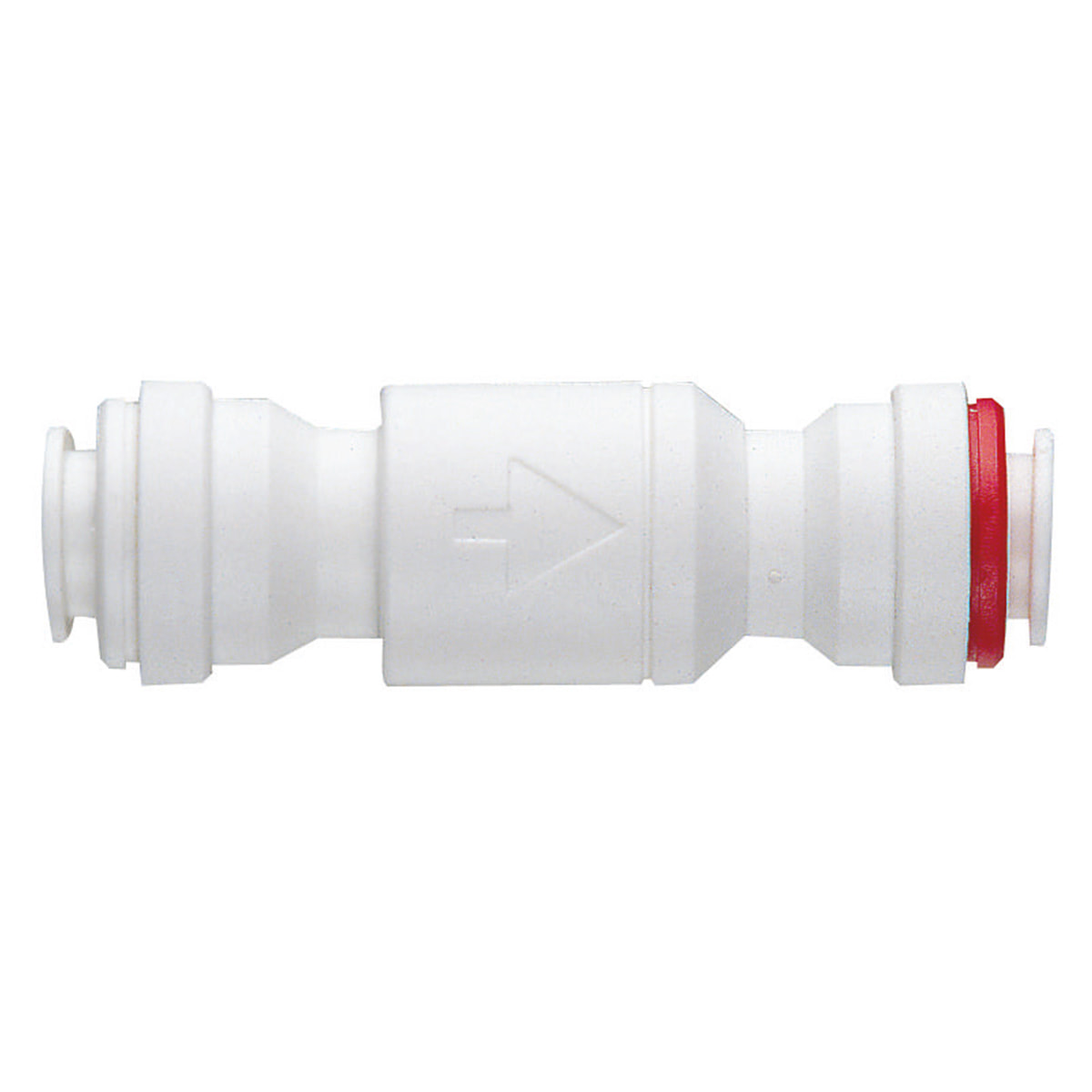 Collection of push fit single check valves from John Guest, which are manufactured from a white acetal.