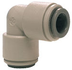 John Guest elbows are similar to the connectors described above but they turn though a 90 degree angle. As with connectors, they come with equal connections or as reducing elbows. There are also John Guest elbows which connect threads to push-fits and these come in two types, rigid elbows or swivel elbows. Rigid elbows have a male thread on one end of the fitting which when screwed in keeps the fitting rigidly in place. A swivel elbow is made up of a push-fit elbow with a straight adapter connected to it which allows the elbow to swivel through 360 degrees.