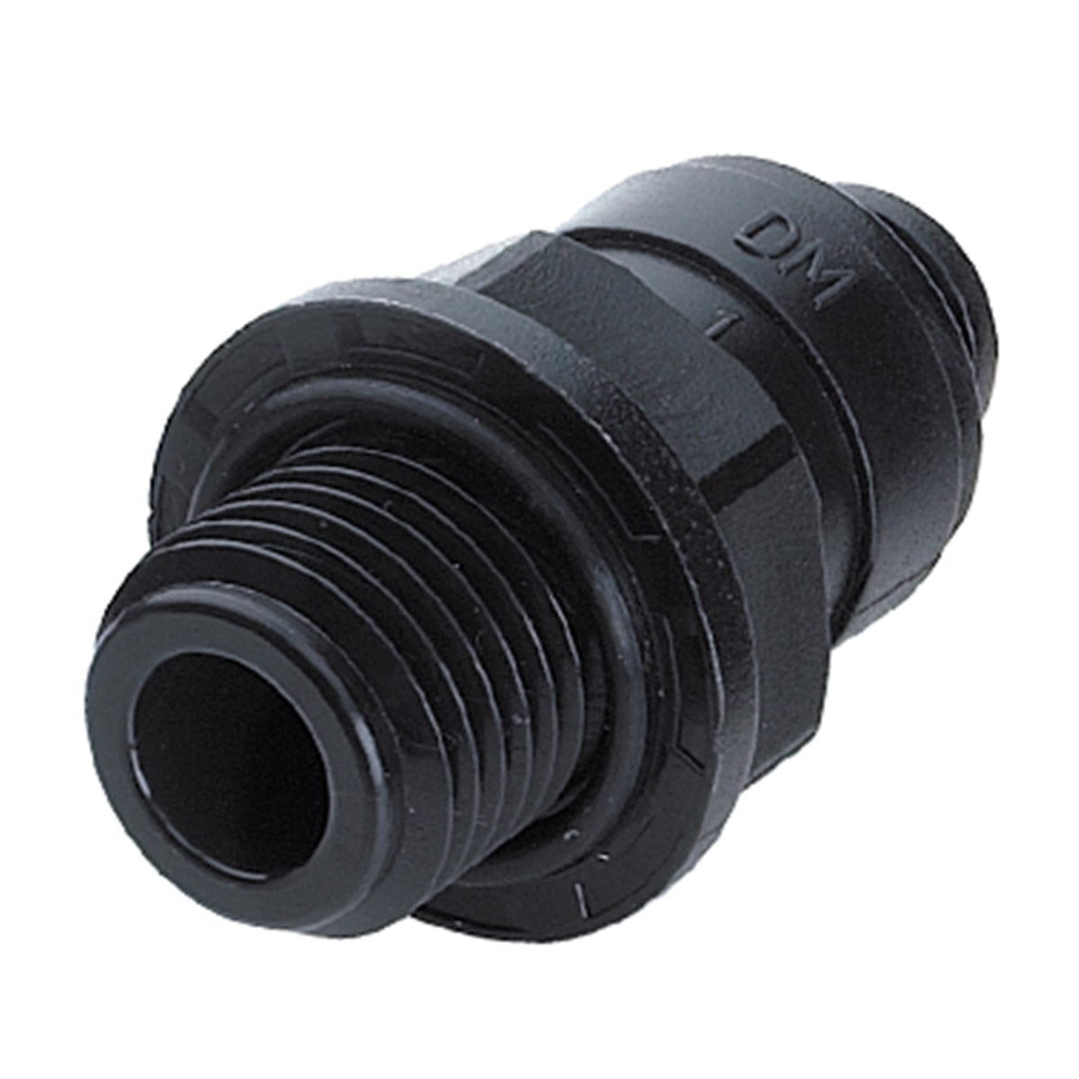 Acetal push fit male adaptors with BSP (British Standard Pipe) threads manufactured by DM Fit and available in a range of different imperial and metric sizes.