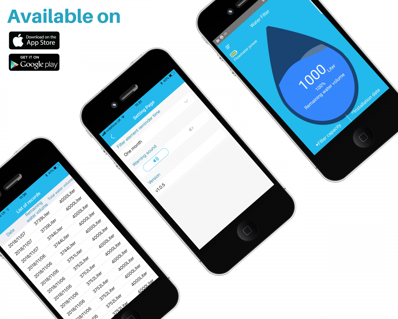 The app provides data on water volume used and filter capacity remaining via Bluetooth while the iHub sends data via WiFi to the cloud making it easy to access your data anywhere at any time eliminating the risk of replacing a filter too soon or leaving an exhausted filter installed.