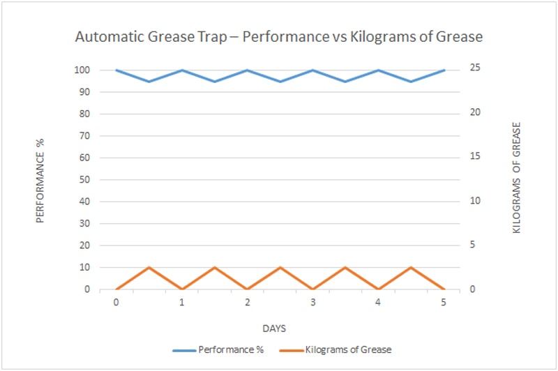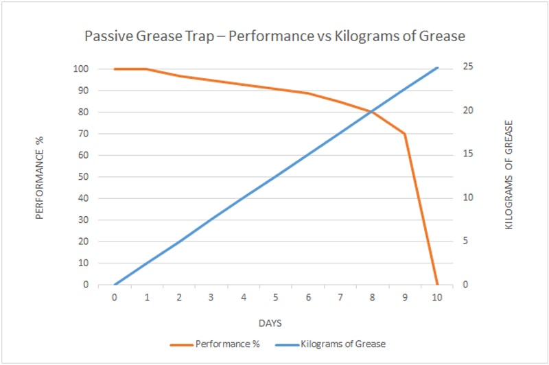 The graphs below give a visual representation of performance vs kilograms of grease based on 25kg traps connected to equipment producing 2.5kg of grease per day: