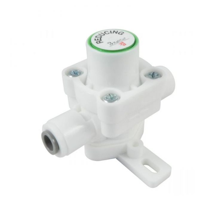 Plastic pressure reducing valve which has a preset outlet pressure of 3 bar and features 1/4" push fit connections and an integral mount bracket for easy install.